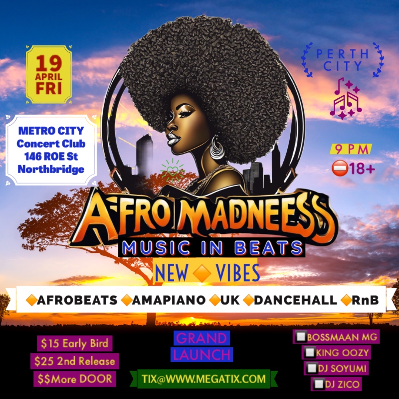 ππ Exciting Announcement! πΆπ₯ Join us at the ROOFTOP SKY BAR in Perth City for AFRO MADNESS - the ultimate celebration of music and beats! π΅π