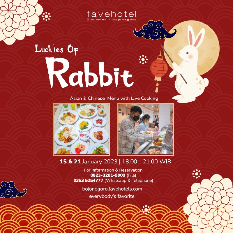 Dibuatnya Promo All You Can Eat - Luckies of Rabbit ini adalah salah satu upaya kami memberikan pilihan kuliner terbaik yang disiapkan Chef profesional kami secara sepenuh hati untuk melewati momen kebersamaan dan spesial anda dengan sajian dan pelayanan terbaik dari favehotel Sudirman Bojonegoro