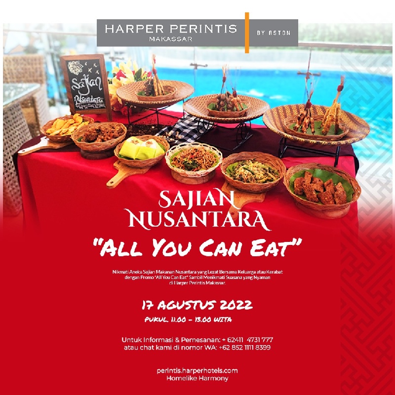 Sajian Nusantara Merdeka merupakan sajian menu promo yang menyajikan makanan khas Nusantara dengan aneka bahan dasar yang diolah dengan bumbu khas tradisional yang tentunya akan semakin memanjakan lidah para pecinta kuliner untuk menikmati momen yang indah di Harper Perintis Makassar