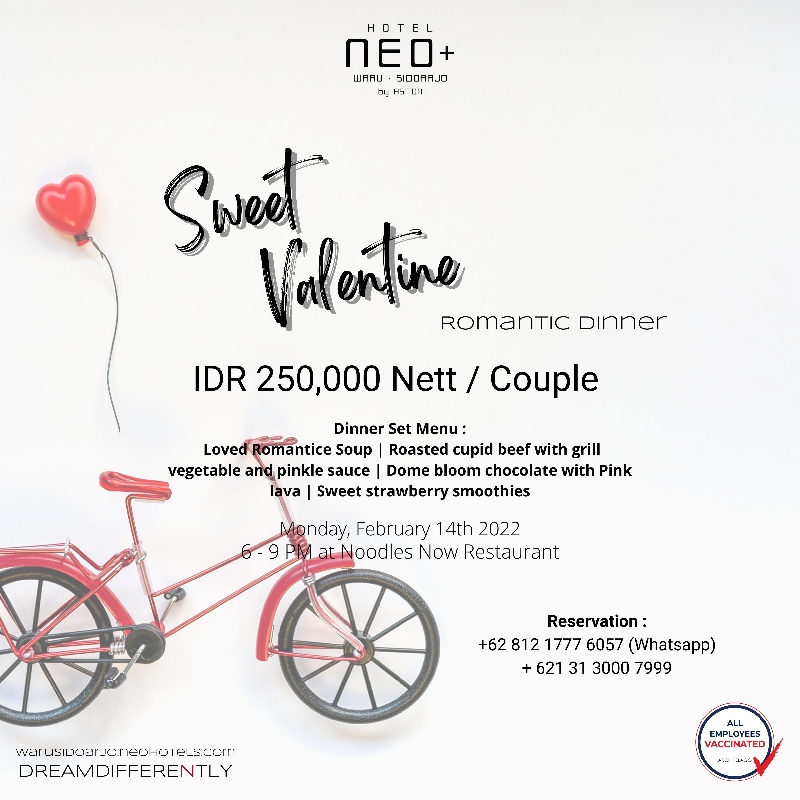 Rayakan Sweet Valentine Romantic Dinner dengan orang tersayang hanya di Hotel Neo+ Waru Sidoarjo. Nikmati berbagai macam dinner set menu yang disajikan langsung oleh chef hotel kami.